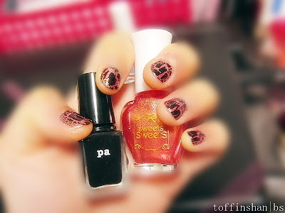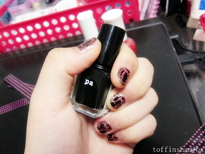 Found a really good angle so you don't have to deal with the blurs anymore on this picture! Okay so, I experimented a little and thought that it'll be really nice to match it up with crackle polish! I have mentioned in my previous blog that I hated PA polishes and that I don't ever wanna buy another PA polish again! But, since it's the only crackle polish I could find! I had no choice.